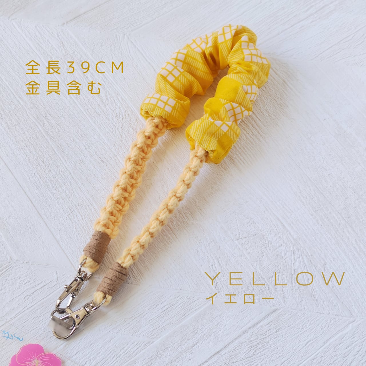 優しい素材で結んだマクラメストラップと組み合わせました